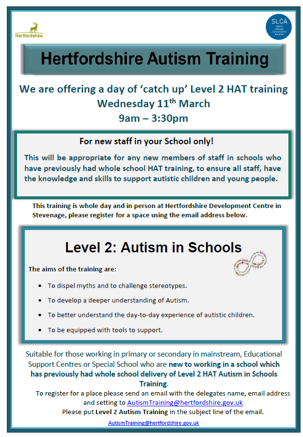 Training offered for professionals. Contact: AutismTraining@hertfordshire.gov.uk for more information.
