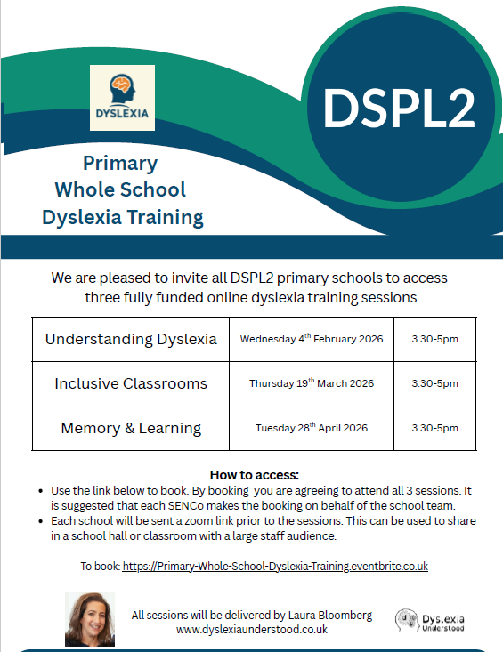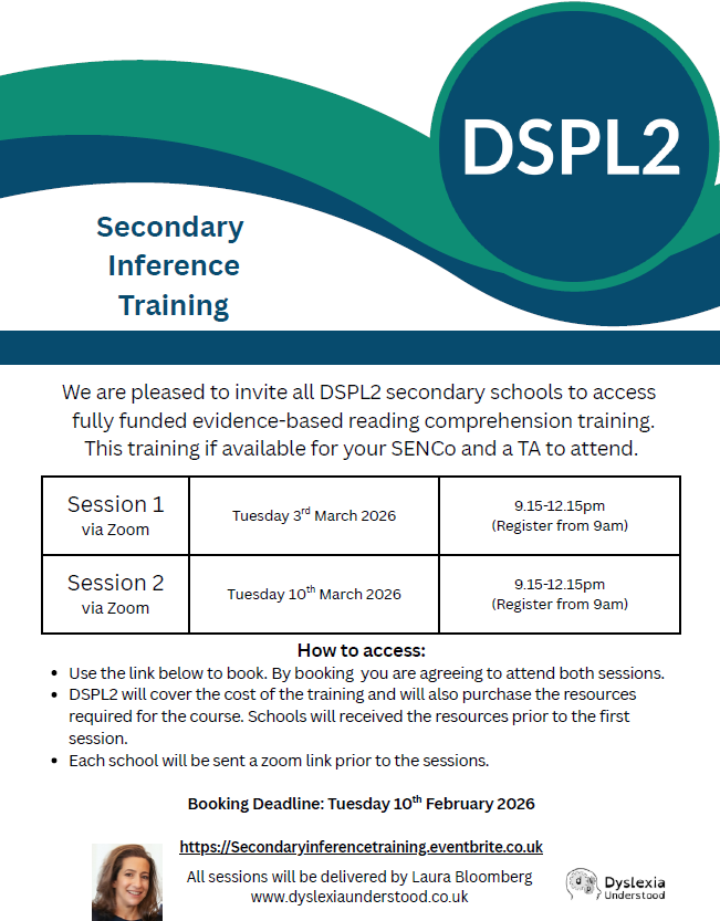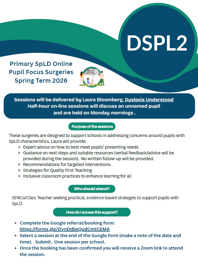 We are delighted to announce that we will be offering the following Specific Learning Difficulties (SpLD) support to DSPL2 schools during the Spring Term 2026. All sessions will be delivered by Laura Bloomberg, Dyslexia Understood.