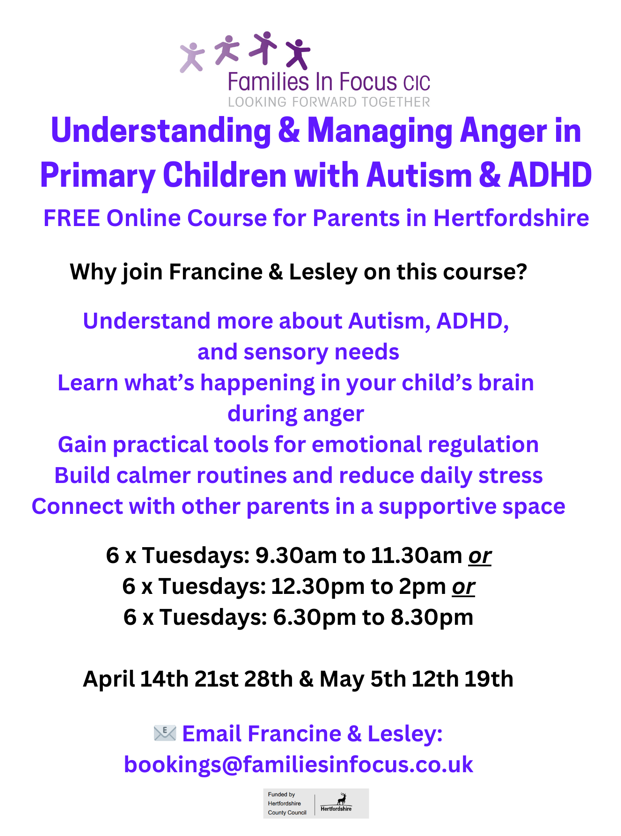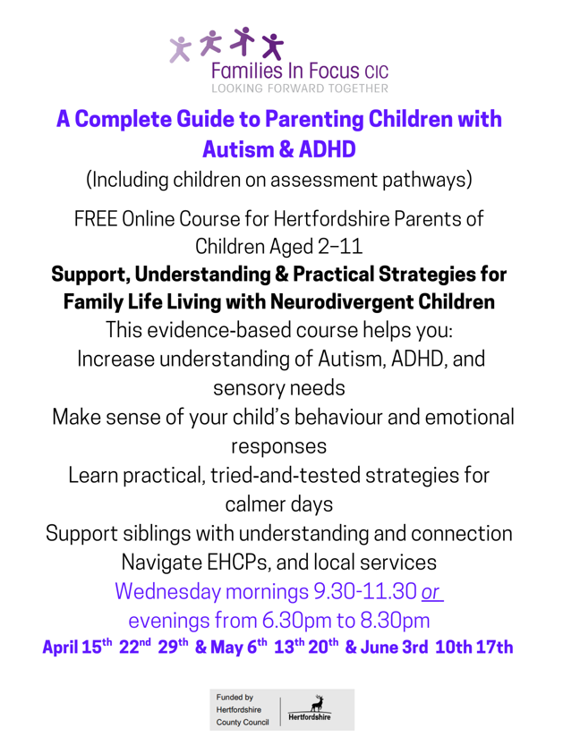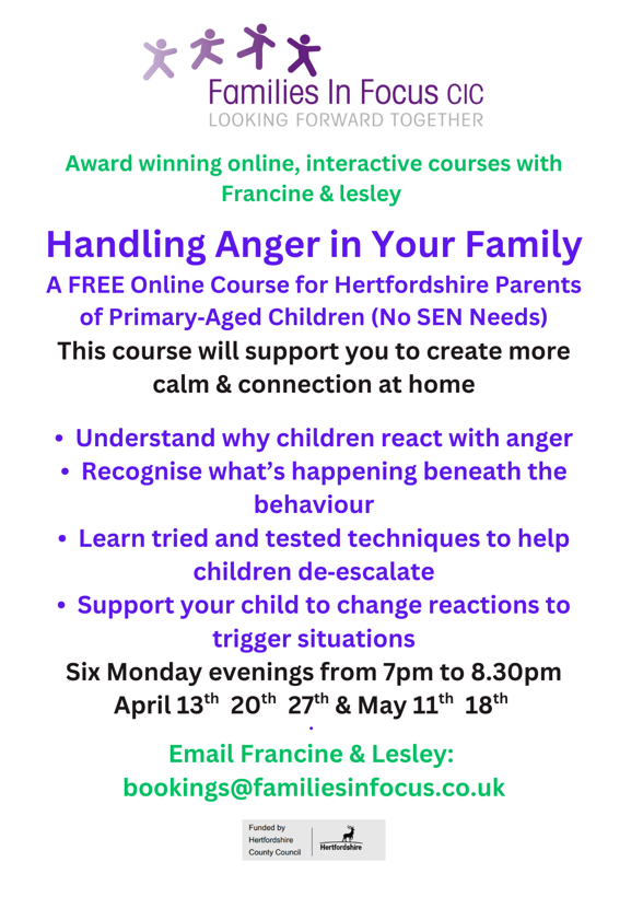 Free (funded by HCC) online, interactive courses from Families in Focus - booking now open.