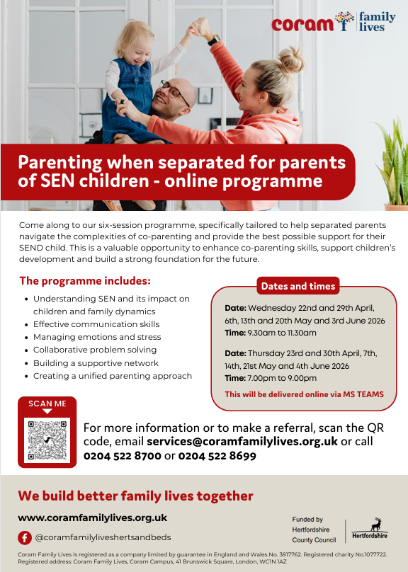 Our six-session programme is specifically tailored to help separated parents navigate the complexities of co-parenting and provide the best possible support for their SEND child. This is a valuable opportunity to enhance co-parenting skills, support children’s development and build a strong foundation for the future.