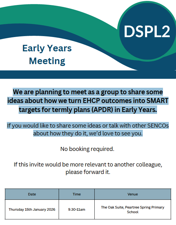 An EHCP Noticeboard below shares information that has been distributed to SENCo's in our Weekly Newsletter or at DSPL2's SENCo Forum.