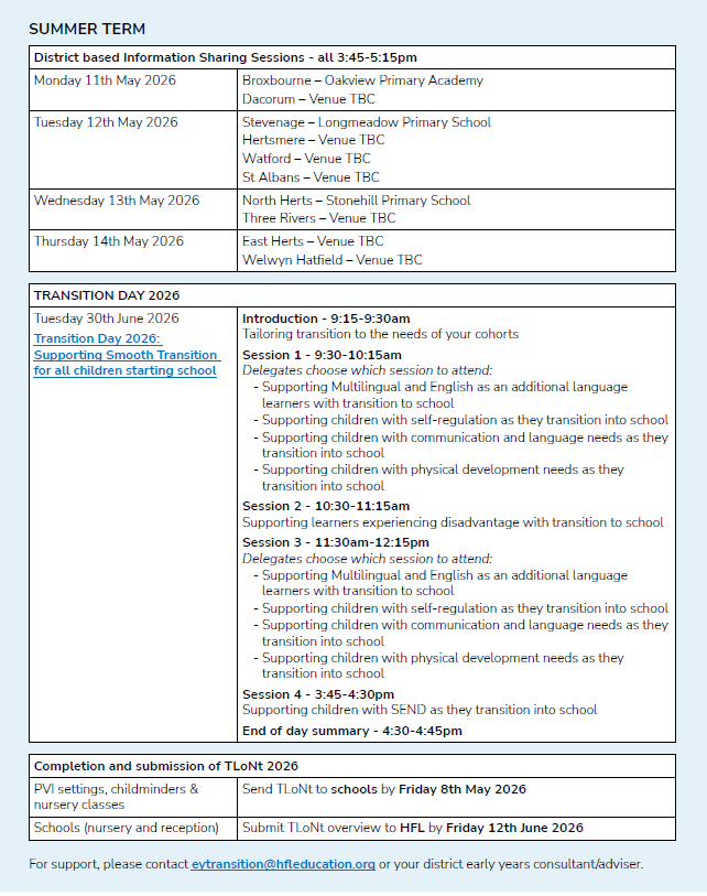 - Contact: A member of the Early Years SEND team will contact receiving settings in September to discuss transition plans and funding utilisation.