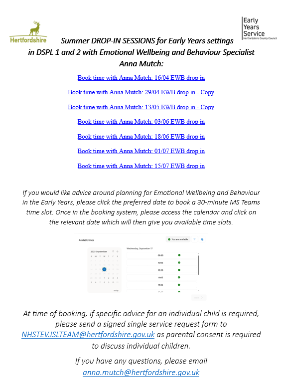 Early Years DSPL1 & 2 Drop-in sessions with Emotional Wellbeing & Behaviour Specialist Anna Mutch (click to open)