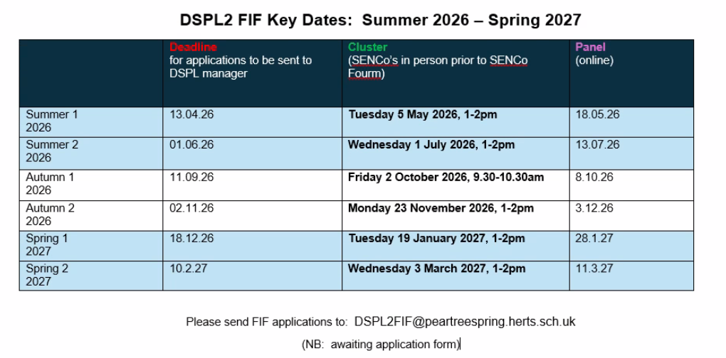 From the summer term 2026, SENCo forums will be extended to include Focused Intervention Funding (FIF) Clusters from 1-2pm, followed by the DSPL2 SENCO forum 2-3pm.