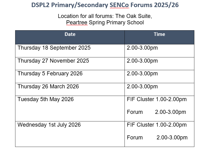 **Please note that the Primary/Secondary SENCo Forum dates in the Summer Term 2026 have changed to accommodate FIF Clusters beforehand.**